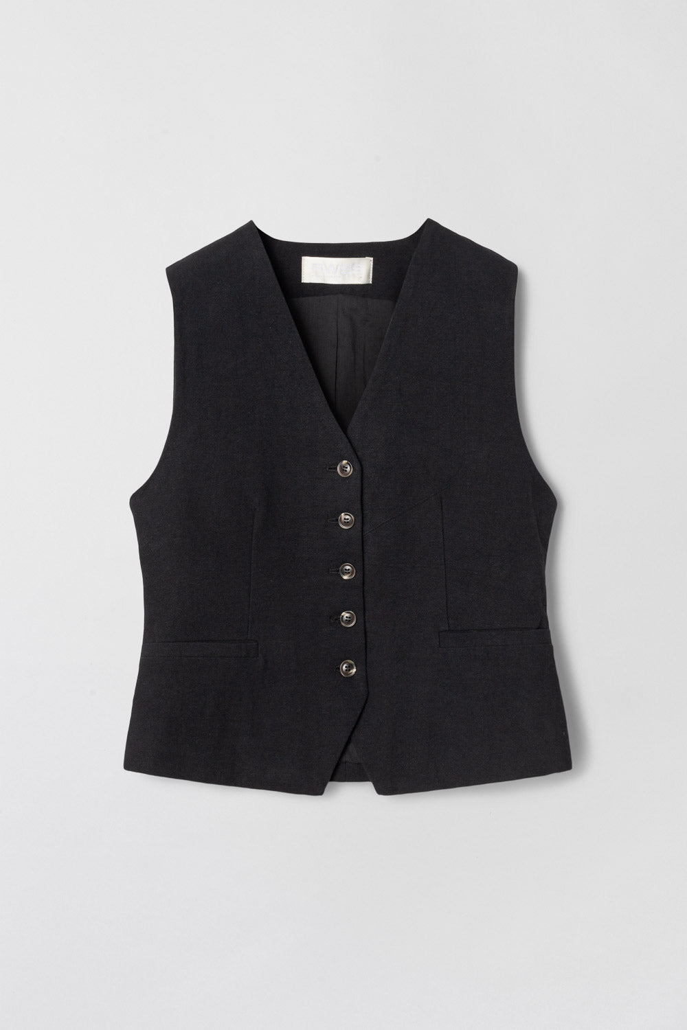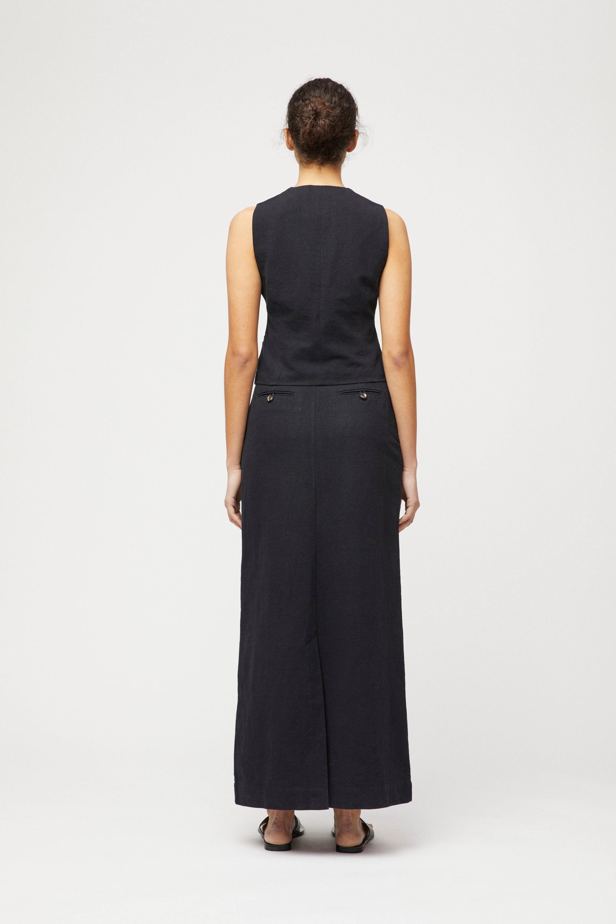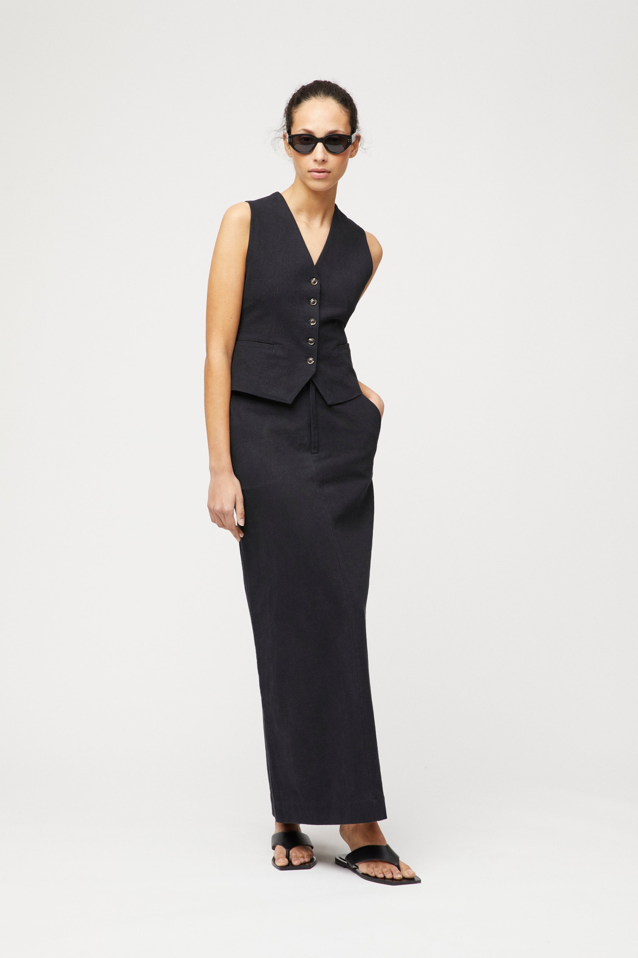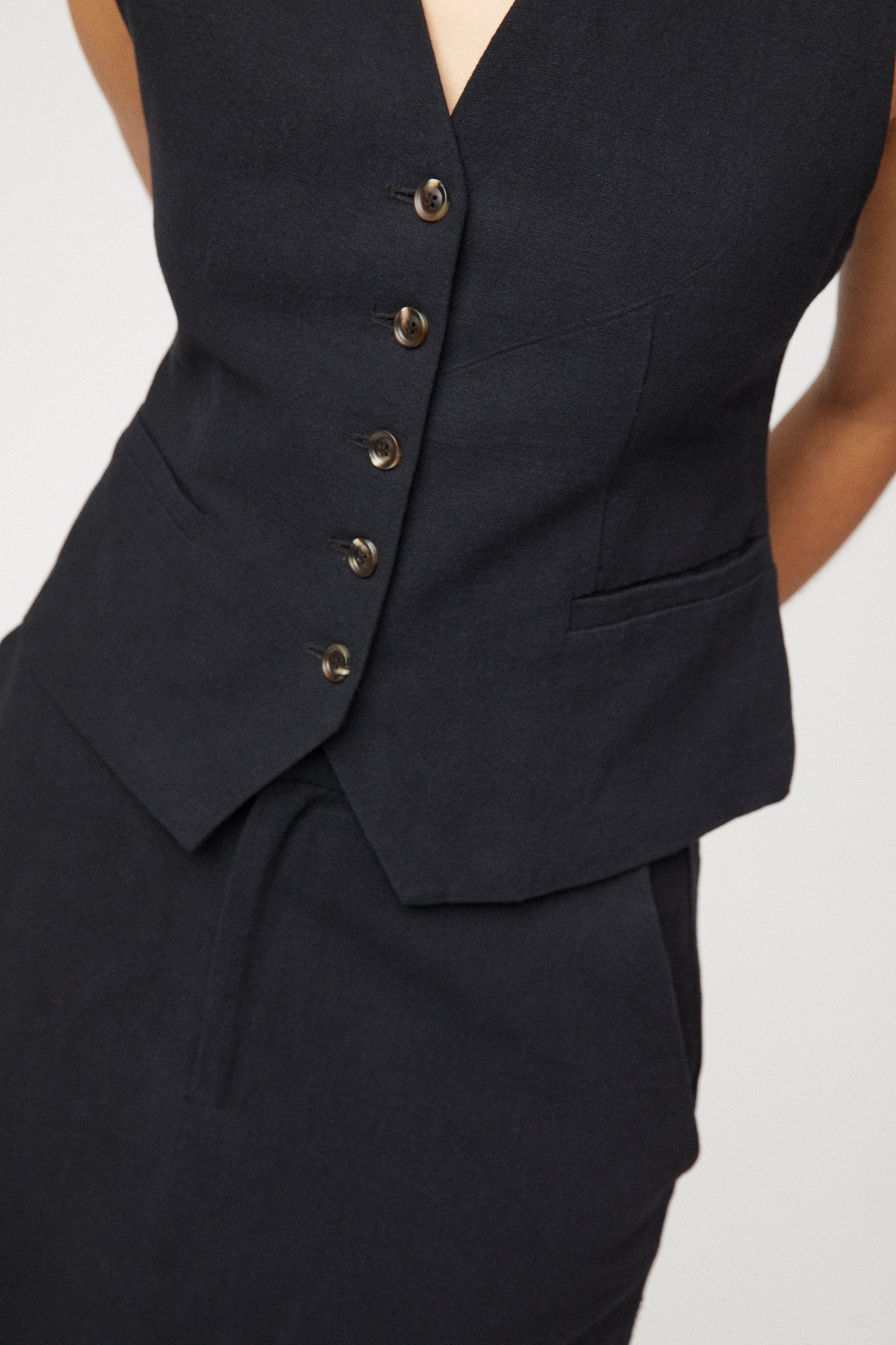 The FWSS Linen Waistcoat is crafted from a luxurious, heavy linen quality. A classic 90s waistcoat that displays understated elegance. Lined for added comfort and designed to flatter with a fitted silhouette at the waist. The button-down closure adds a touch of refinement, while the single welt pocket provides a stylish detail. Whether layered over a crisp shirt for a polished look or paired with casual trousers for a more relaxed vibe, this waistcoat is a versatile addition to any wardrobe, perfect for both festive occasions and everyday wear. Style together with the matching FWSS Linen Côte d’Azur Skirt.
