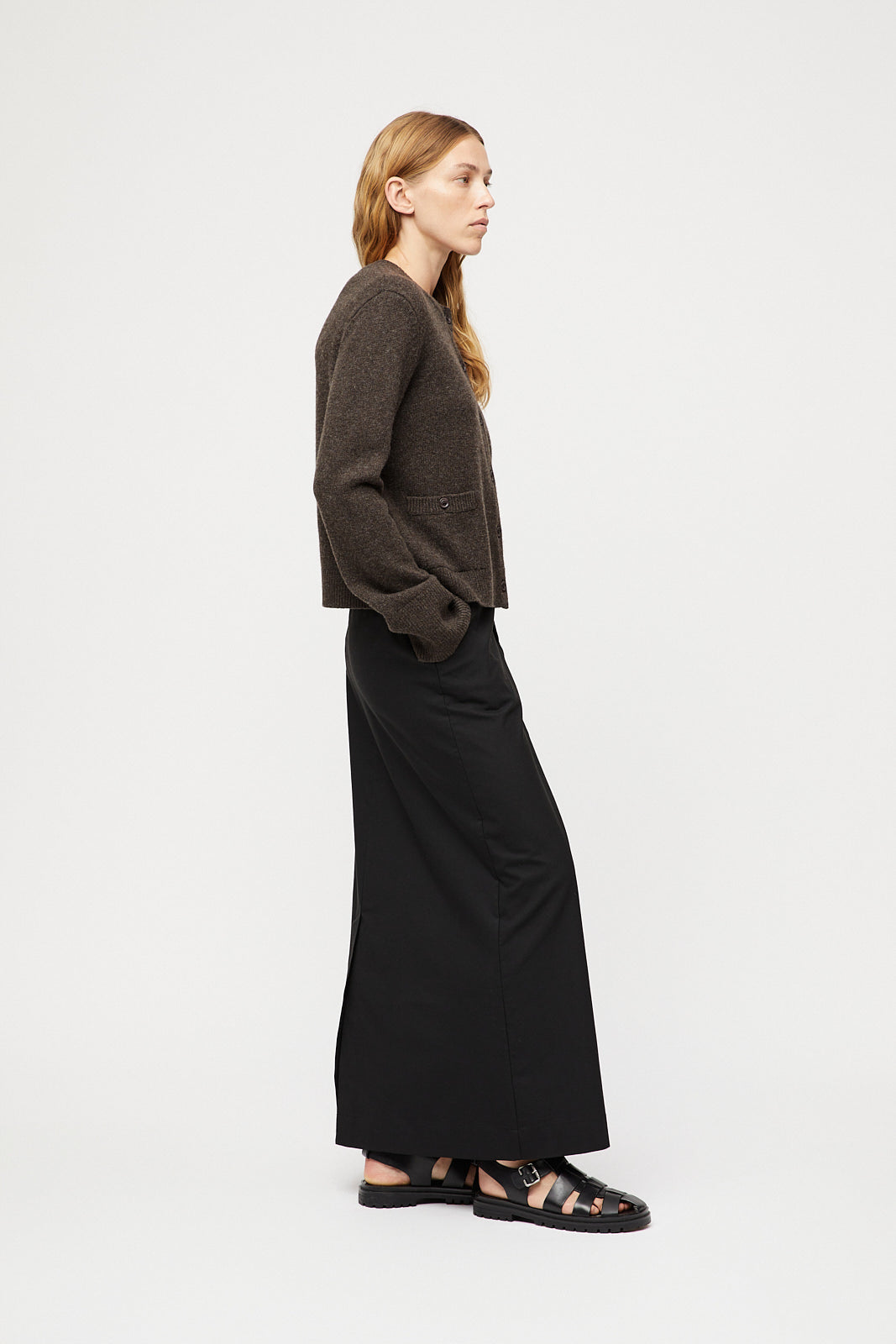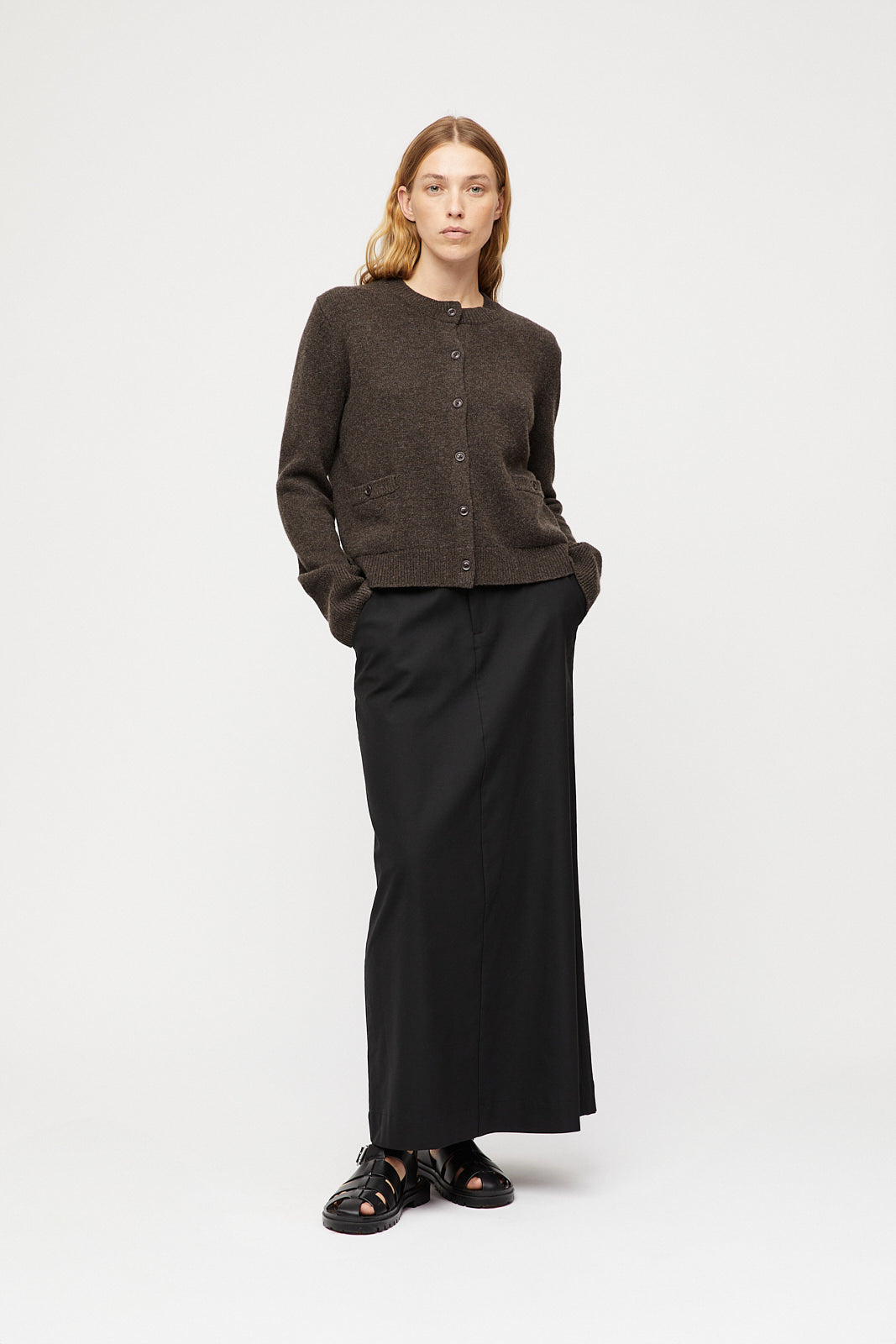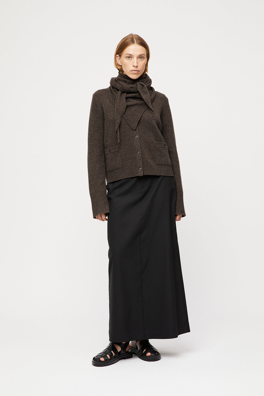 The FWSS Structured Wool Cardigan is crafted from 100% extrafine merino wool, offering a super soft brushed handle that feels luxurious against the skin. Designed for a relaxed fit with a feminine silhouette, the cardigan is beautifully detailed with a delicate button-down closure and subtle pockets in the front. The rib-knitted collar and long sleeves add to its sophisticated charm. Over-dimensional bell-shaped sleeves enhance the luxurious feel, making this cardigan a standout addition to any wardrobe. Style with FWSS Côte d’Azur Skirt for a chic look that effortlessly combines comfort and elegance.