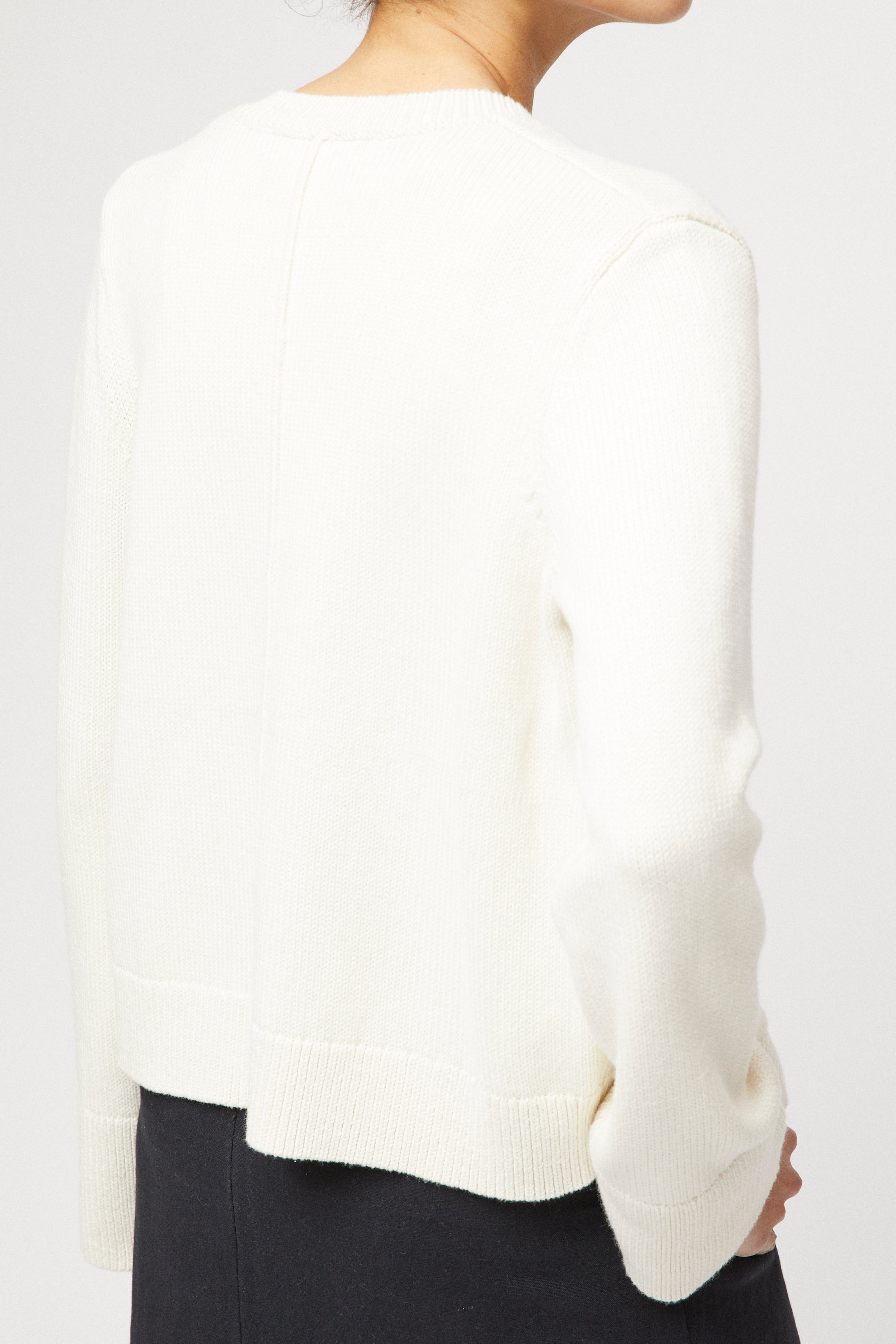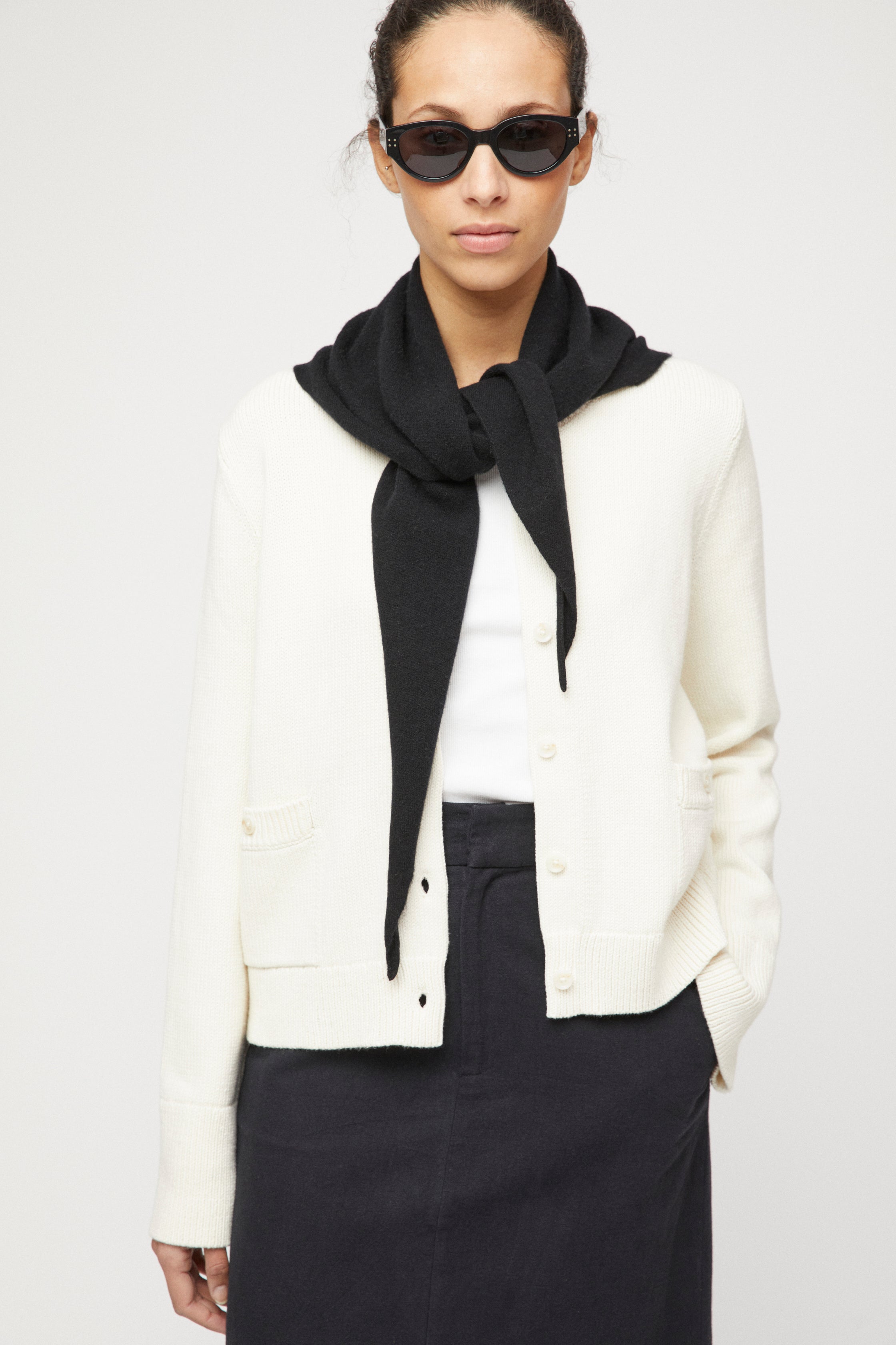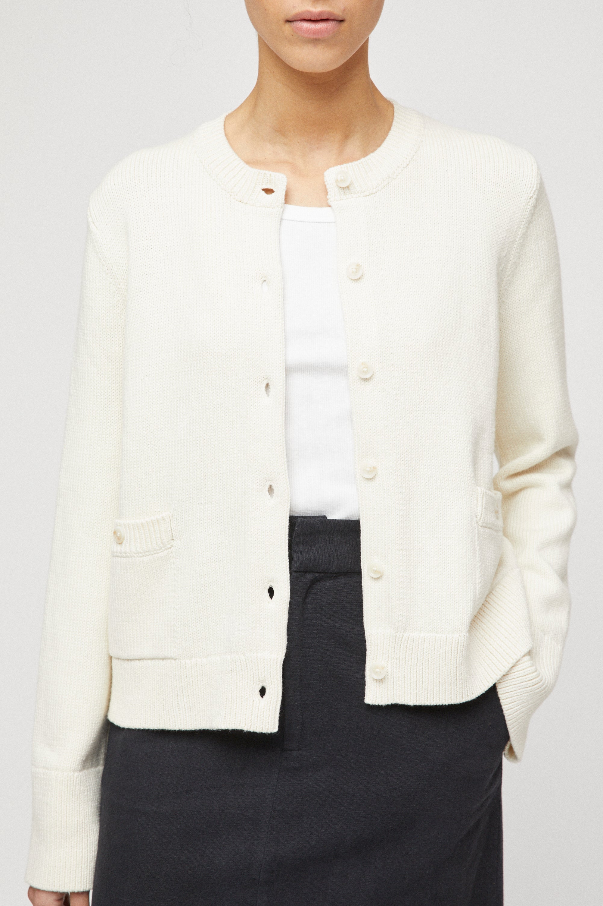 The FWSS Structured Cotton Cardigan is crafted for comfort and style. Made from 100% fine cotton, it offers a relaxed yet structured fit, with a feminine silhouette in a slight crop body. Features include a delicate buttoned closure and a subtle, small front pocket. The over-dimensional bell-shaped sleeves add a luxurious touch. Style with FWSS Linen Côte d'Azur Skirt and sandals for a refined look.