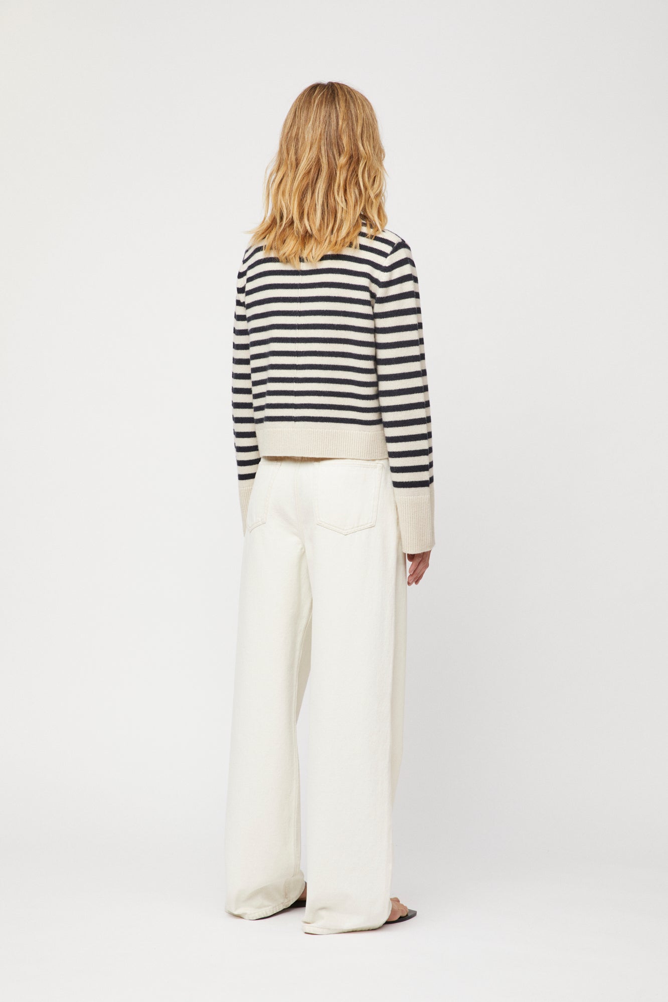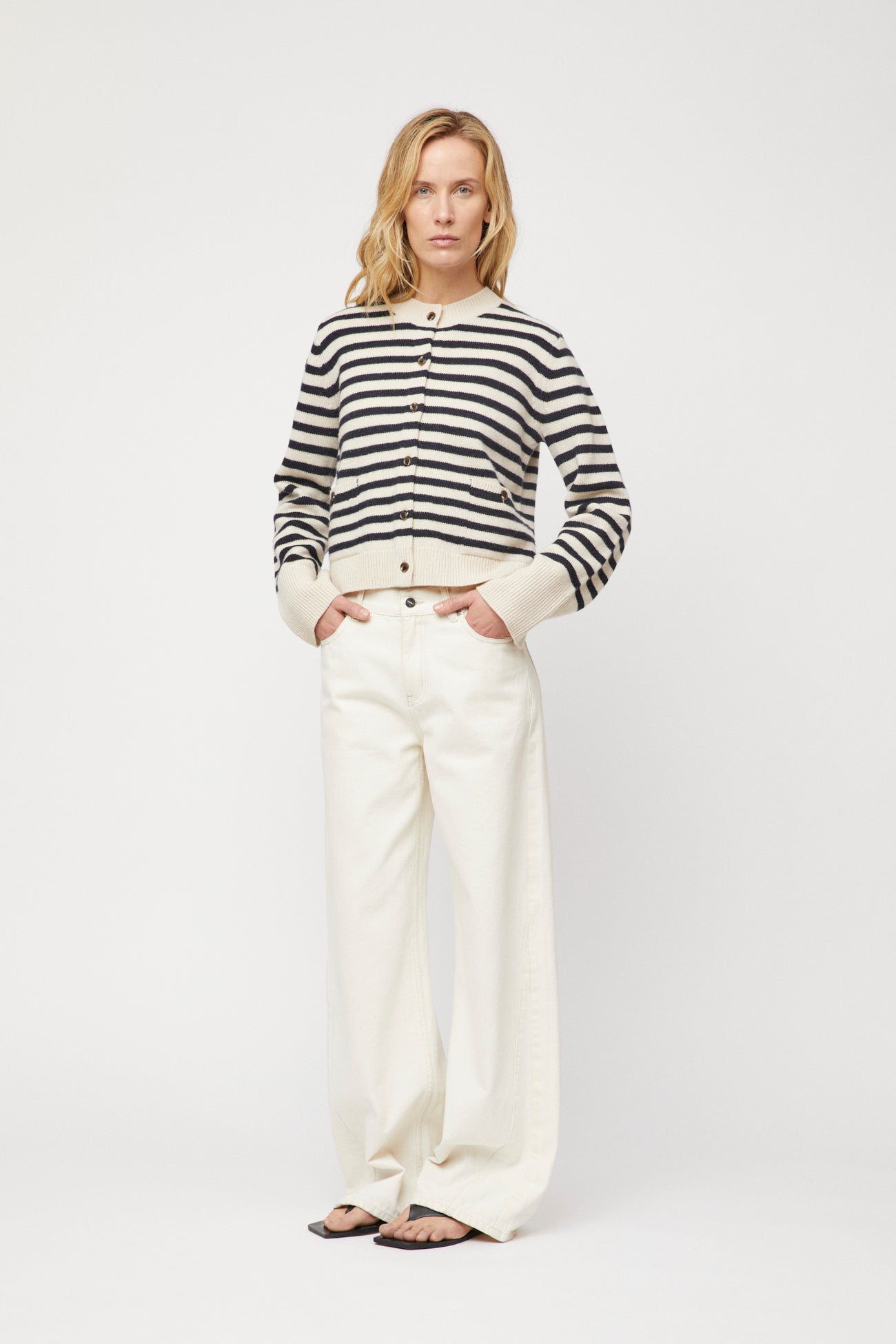 The FWSS Structured Wool Cardigan is knitted in 100% extrafine merino wool with a supersoft brushed handle. Beautifully designed for a relaxed fit, with a feminine silhouette in a slight crop body. It has a delicate buttoned down closing and a subtle, small pocket at front. The over-dimensional bell shaped sleeves add to the luxurious feel. Style with FWSS Côte D'Azur Shorts and riding boots.