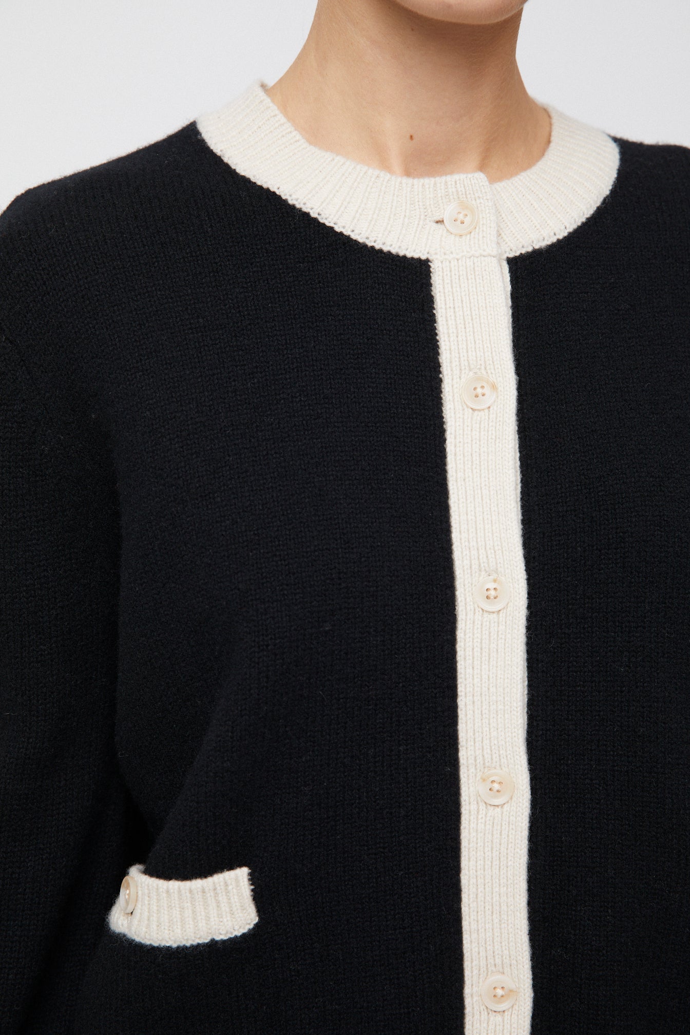 The FWSS Structured Wool Cardigan is made from 100% extrafine merino wool with a soft brushed finish. It features a relaxed fit with a feminine silhouette. The bell-shaped sleeves add volume, making it a versatile piece for everyday wear.
