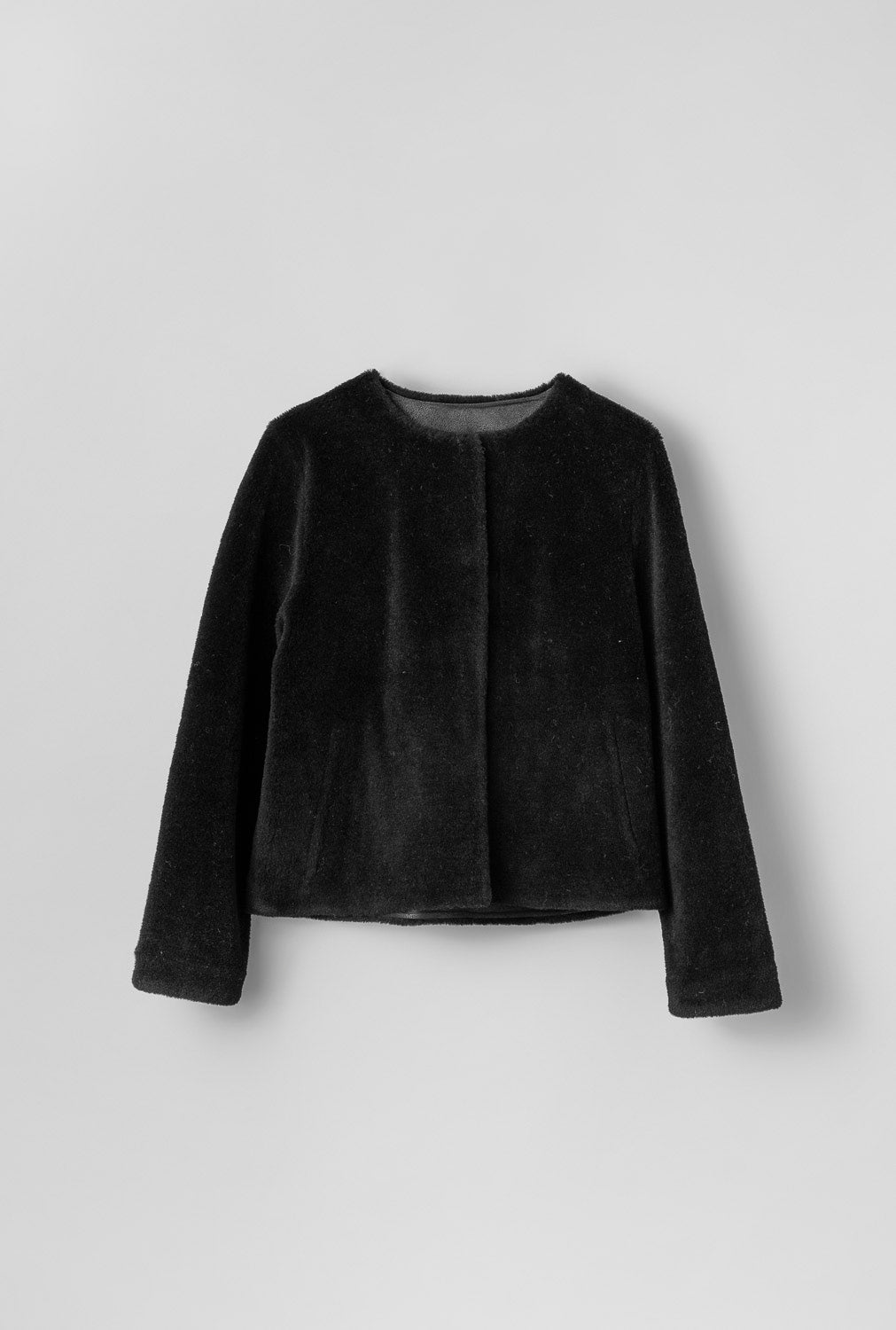 The FWSS The Trip Friendly Fur is a short jacket in an animal friendly teddy fur made by fine lambswool fibres carefully knitted into a polyester backing. The quality has the warmth, softness and comfort from the lambswool and the stability and strength from its polyester backing – making for long-lasting and functional outerwear, without compromising on design and aesthetics. Features a clean neckline, subtle slash pockets and snap button closing at front.