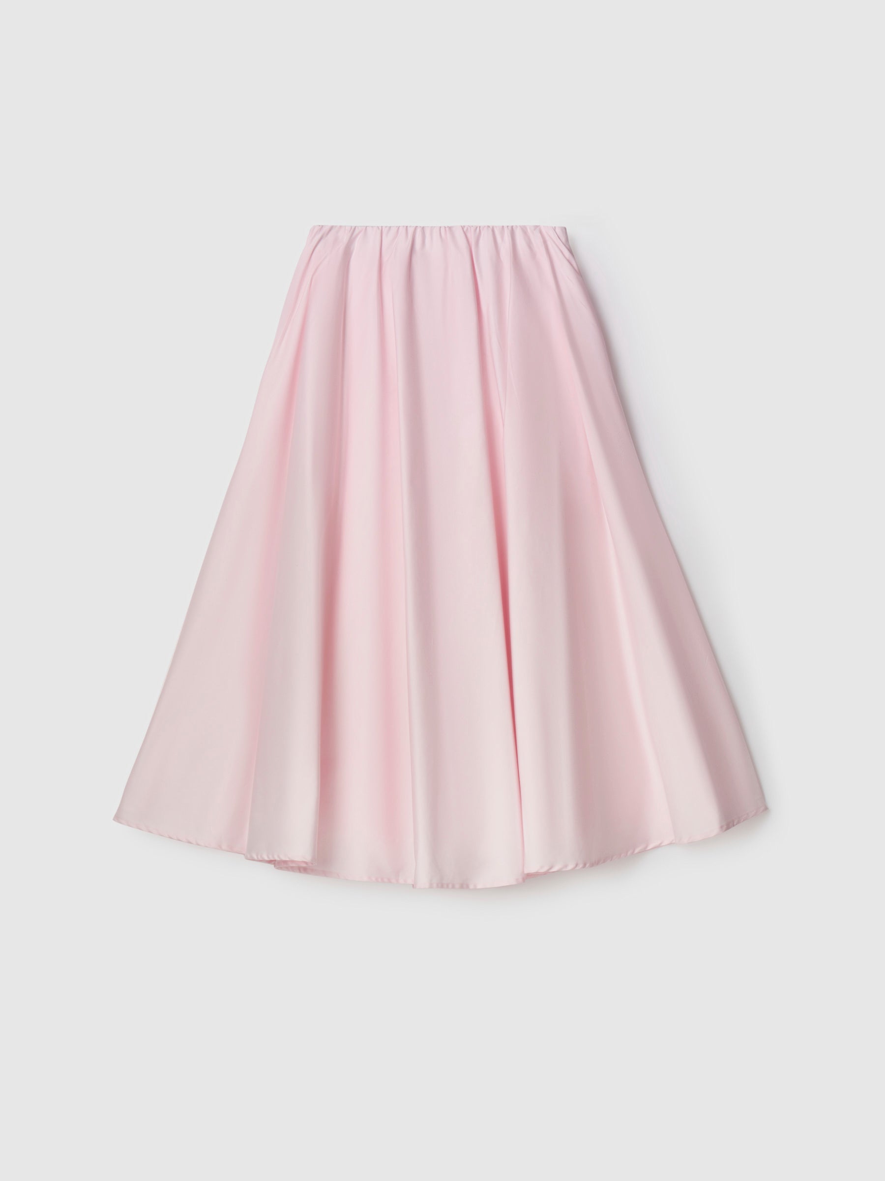 The FWSS Vivienne Midi Skirt is crafted in cotton with a subtle sheen. Designed with a ruched elastic waistband, hidden side pockets, and an invisible back zip, it is double-layered for volume and fluidity. A versatile favorite from office to evening.