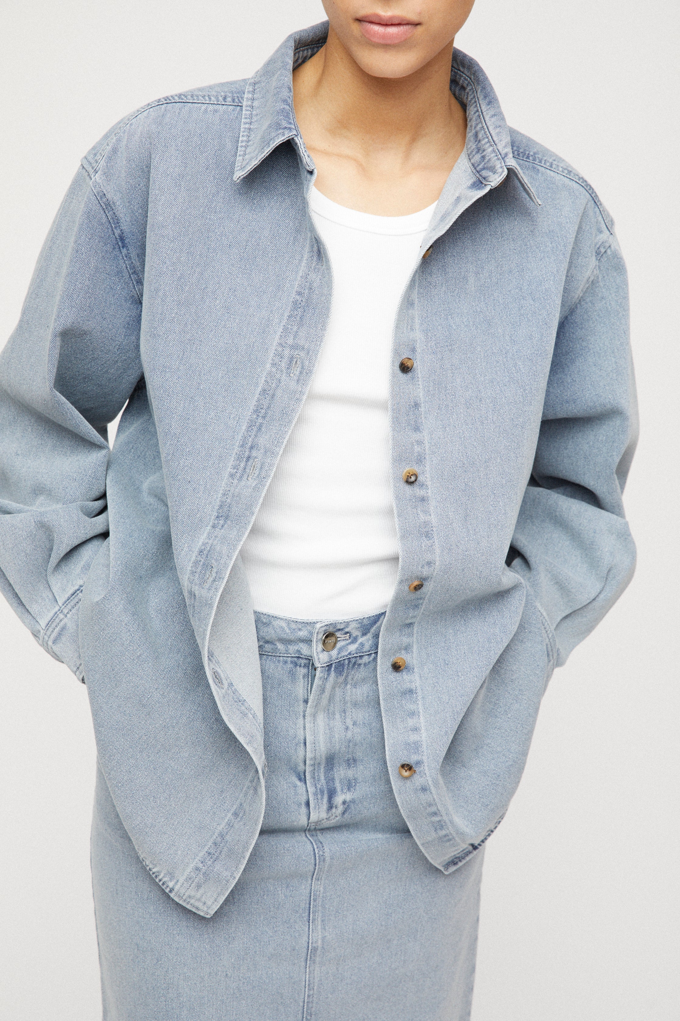 The FWSS Workwear Shirt is cut from 100% sturdy cotton. The silhouette is inspired by the FWSS Coastal Shirt, with a slightly oversized fit. A heavy-washed cotton shirt with delicate pleat details at cuffs and curved hemline. The double-layered panel at back provides for natural movement. Its heavy structure gives a modern take on the classic buttoned shirt. There is plenty of versatility to this piece as it easily can be styled as a jacket over a top, and it’s the summer shirt that transitions perfectly from day to night. Style with the matching FWSS Midi Denim Skirt for a complete look.